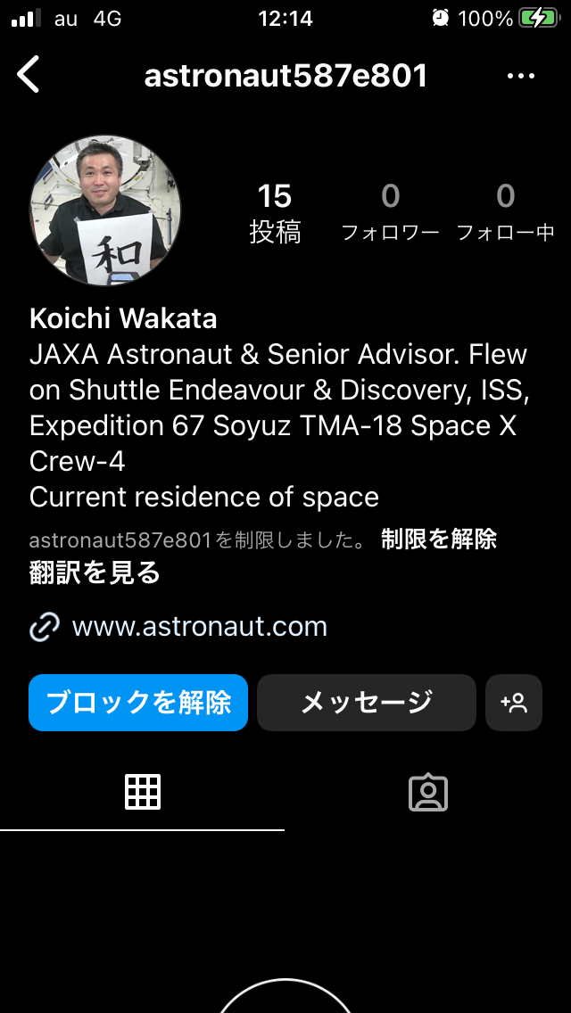 先日インスタのアカウントで、有名な宇宙飛行士の方からフォローされたので、エッ❓そんなことあるのかしら❓って思いながら面白そうなのでフォローバックしてみました