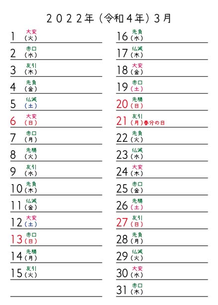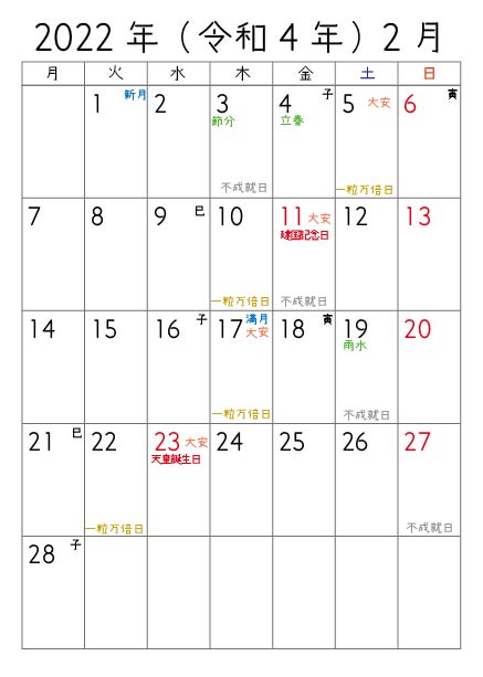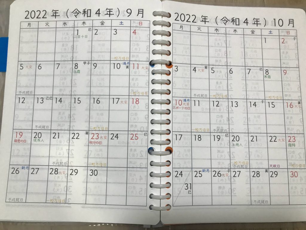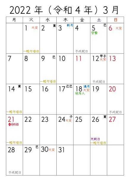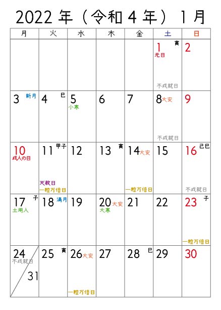 一粒万倍日・不成就日・大安・新月・満月・巳の日・寅の日・子の日・二十四節気がわかるようにつくりました(^^)/ 月曜始まりです